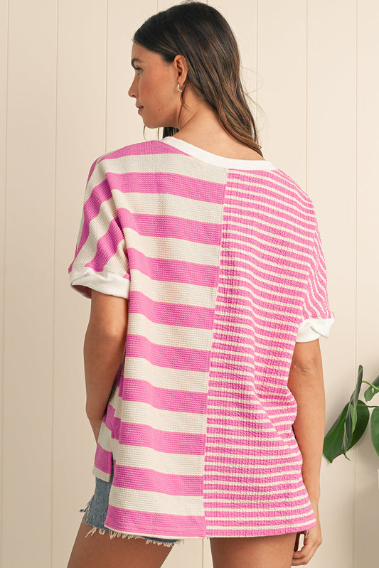Pink Stripe Waffle Patchwork Short Sleeve High Low Loose T Shirt