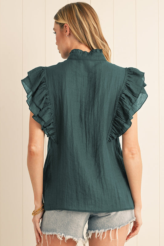 Skobeloff Buttoned V Neck Ruffle Short Sleeve Blouse