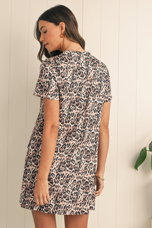 Brown Leopard Print Short Sleeve Pocket Mini Dress