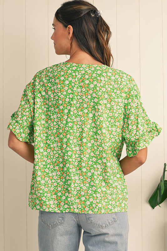 Green Floral Print Ruffle Sleeve V Neck Pleated Blouse