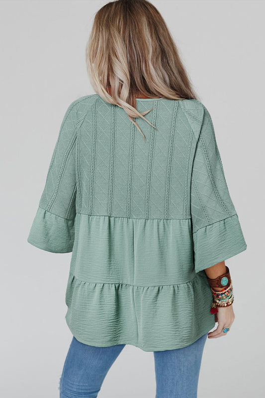 Laurel Green Tie Split Neck Textured Ruffle Patchwork Blouse