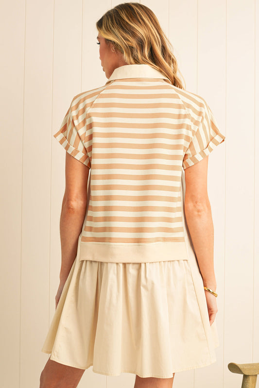 Khaki Striped Patchwork Short Sleeve Collared Mini Dress