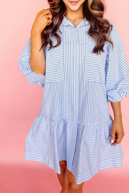 Sky Blue Striped Pocket Ruffle Hem Mini Dress