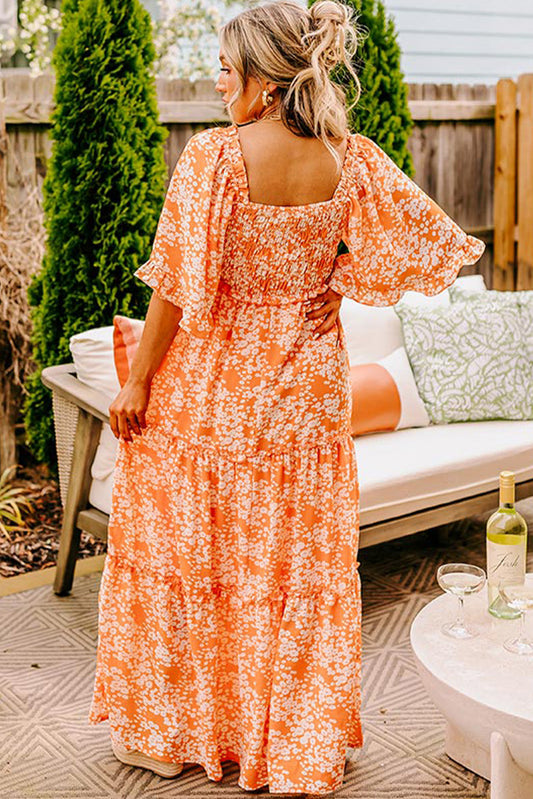 Orange Floral Print Smocked V Neck Bell Sleeve Maxi Dress