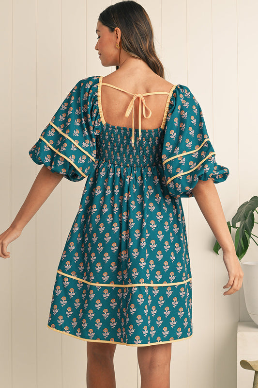 Green Floral Print Piping Trim Bubble Sleeve Bohemian Dress