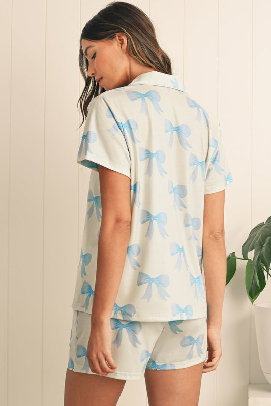 Yellow Bow Printed Short Sleeve Shirt Shorts Pajama Set